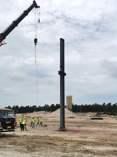 2020年8月16日11:16,經(jīng)過為期兩個(gè)月的基礎(chǔ)開挖,基坑換填,承臺(tái)施工,墩柱施工,鋼構(gòu)預(yù)埋,廣西新福興硅科技產(chǎn)業(yè)園聯(lián)合車間第一根鋼柱立起來了!